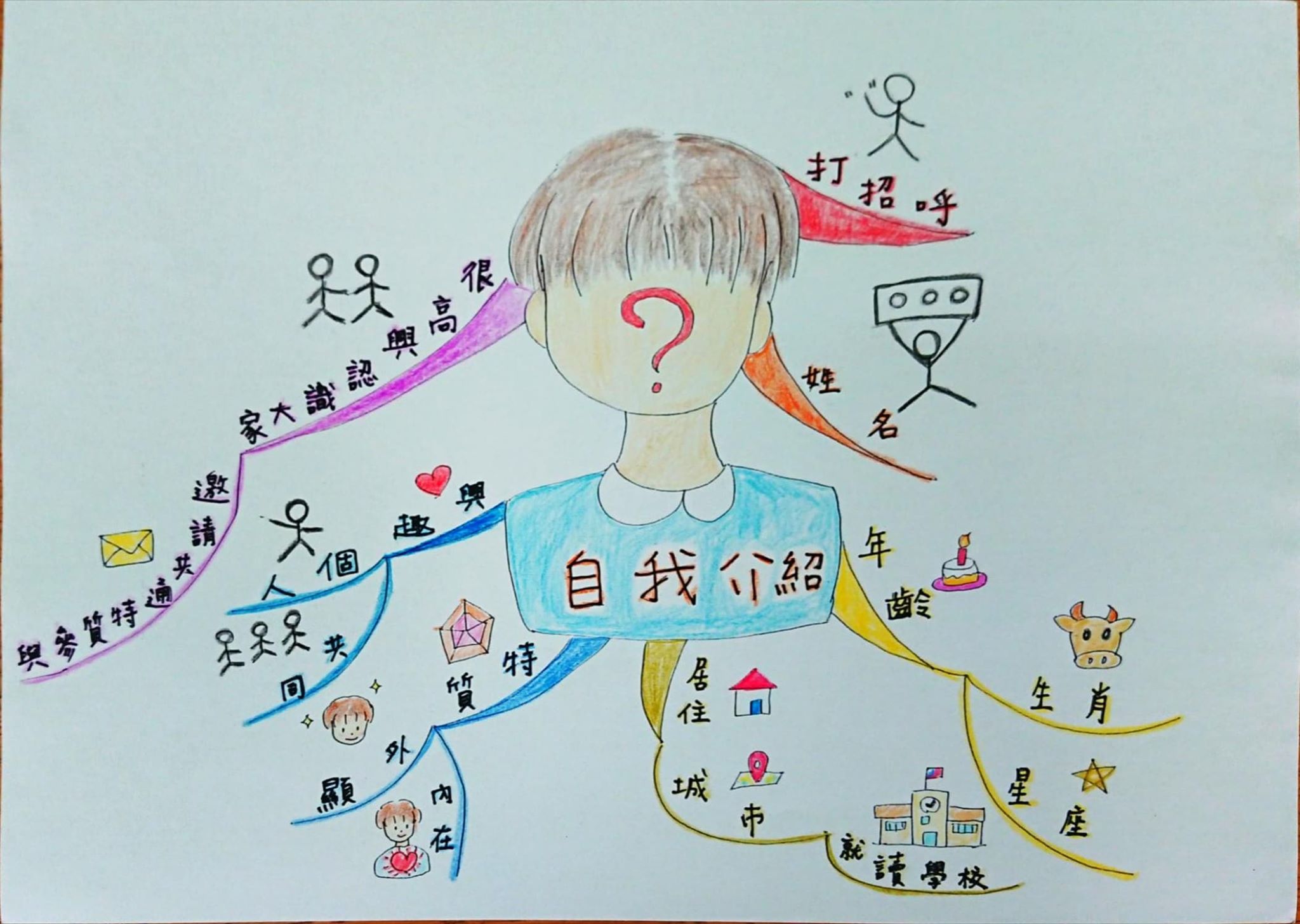 大約從五年前開始,在王麗雪語言治療師的建議與引導下,一起嘗試以心智圖為媒介,幫助發展遲緩等學習困難的兒童。這次的心智圖主題是「自我介紹」,因此我依臨床所見發展遲緩等兒童的需求,繪製了心智圖版本的自我介紹模板。